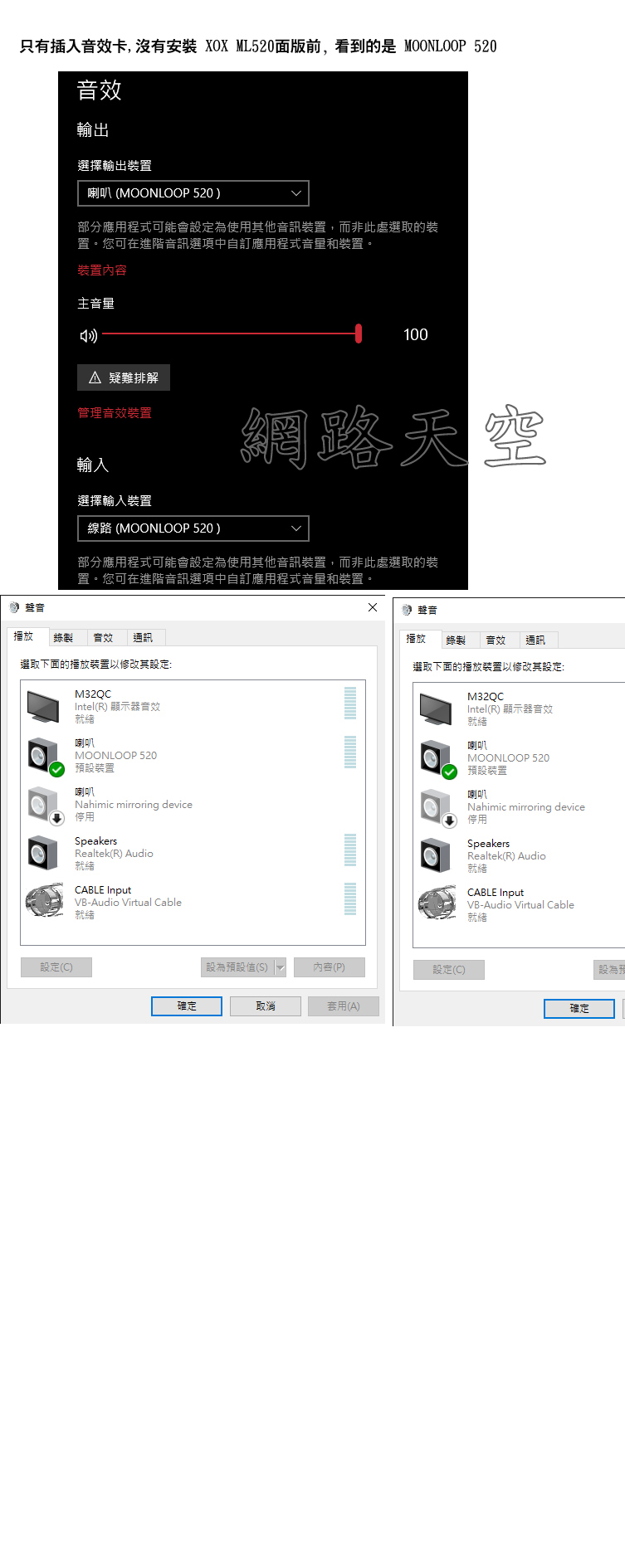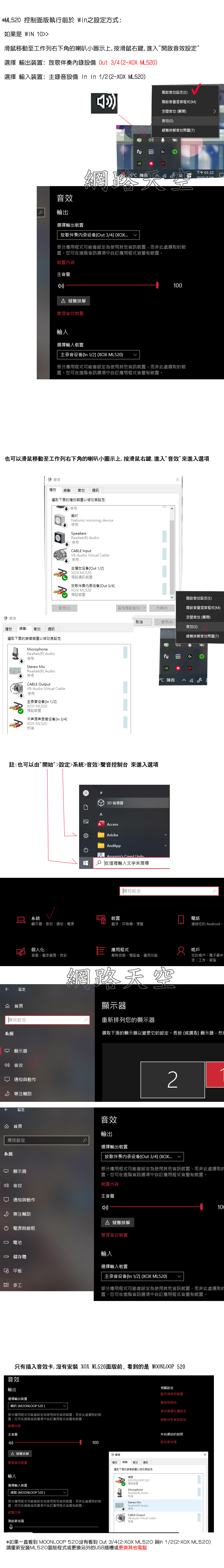 註:只有插入音效卡,沒有安裝 XOX ML520面版前看到的是 MOONLOOP 520的聲卡選項,看不到 Out 3/4(2-XOX ML520)設備 In 1/2(2-XOX ML520)