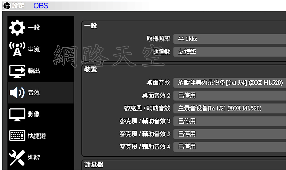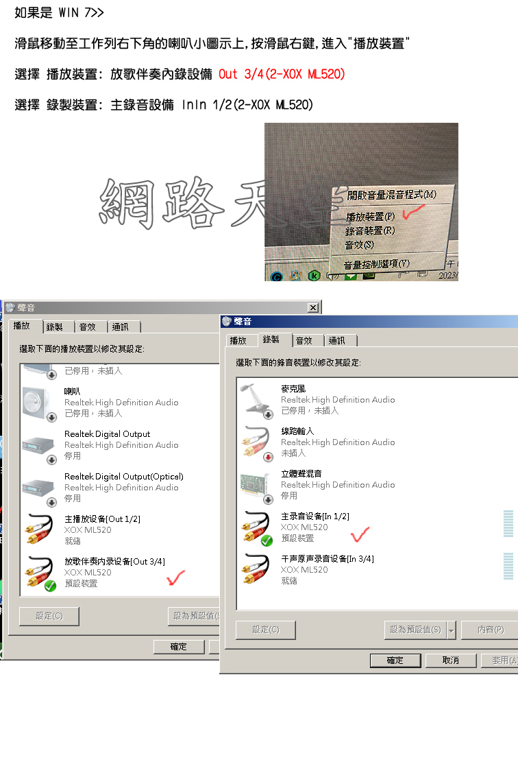 選擇 播放裝置: 放歌伴奏內錄設備 Out 3/4(2-XOX ML520)