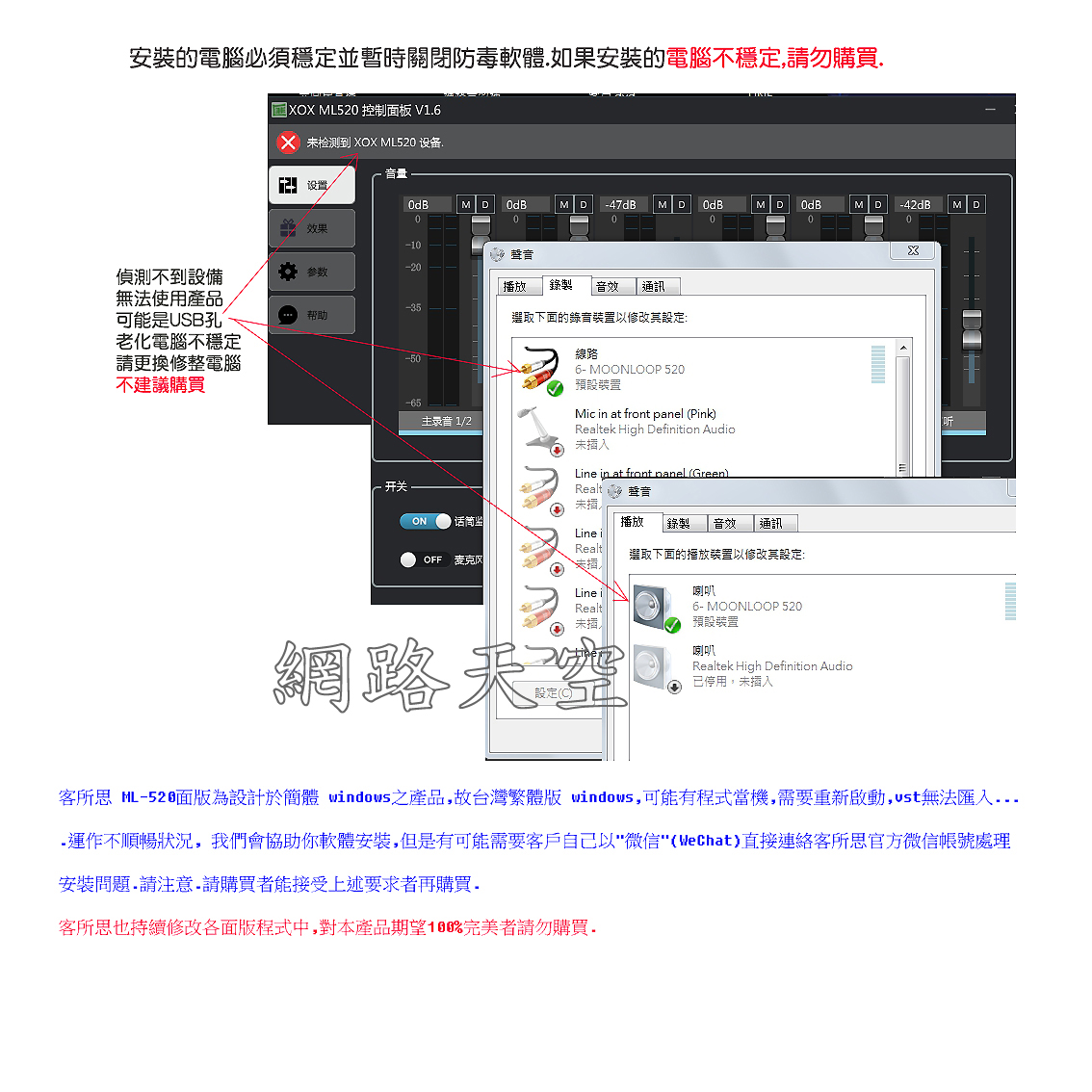客所思 ML-520面版為設計於簡體 windows之產品,故台灣繁體版 windows,可能有程式當機,需要重新啟動,vst無法匯入....運作不順暢狀況,